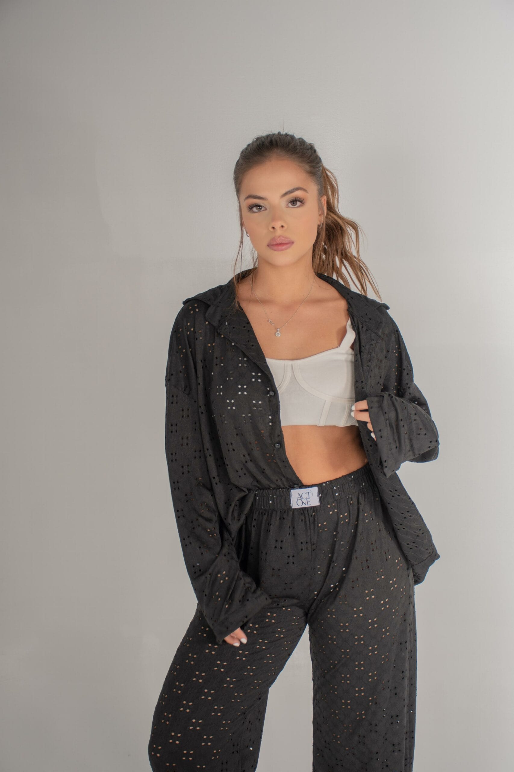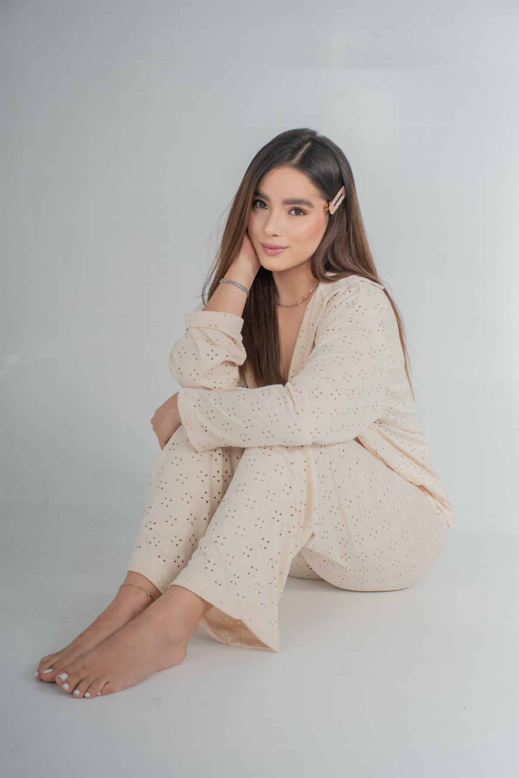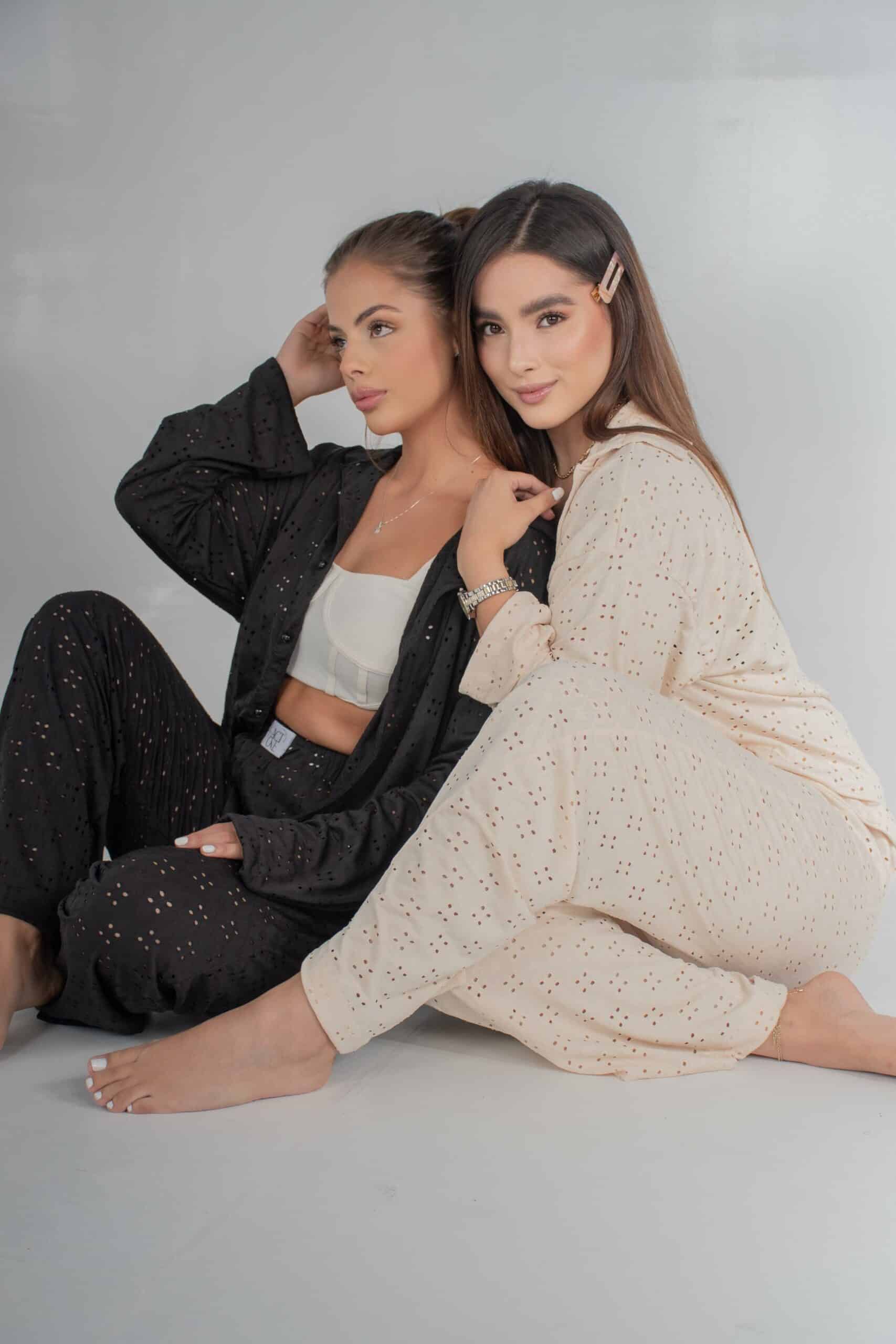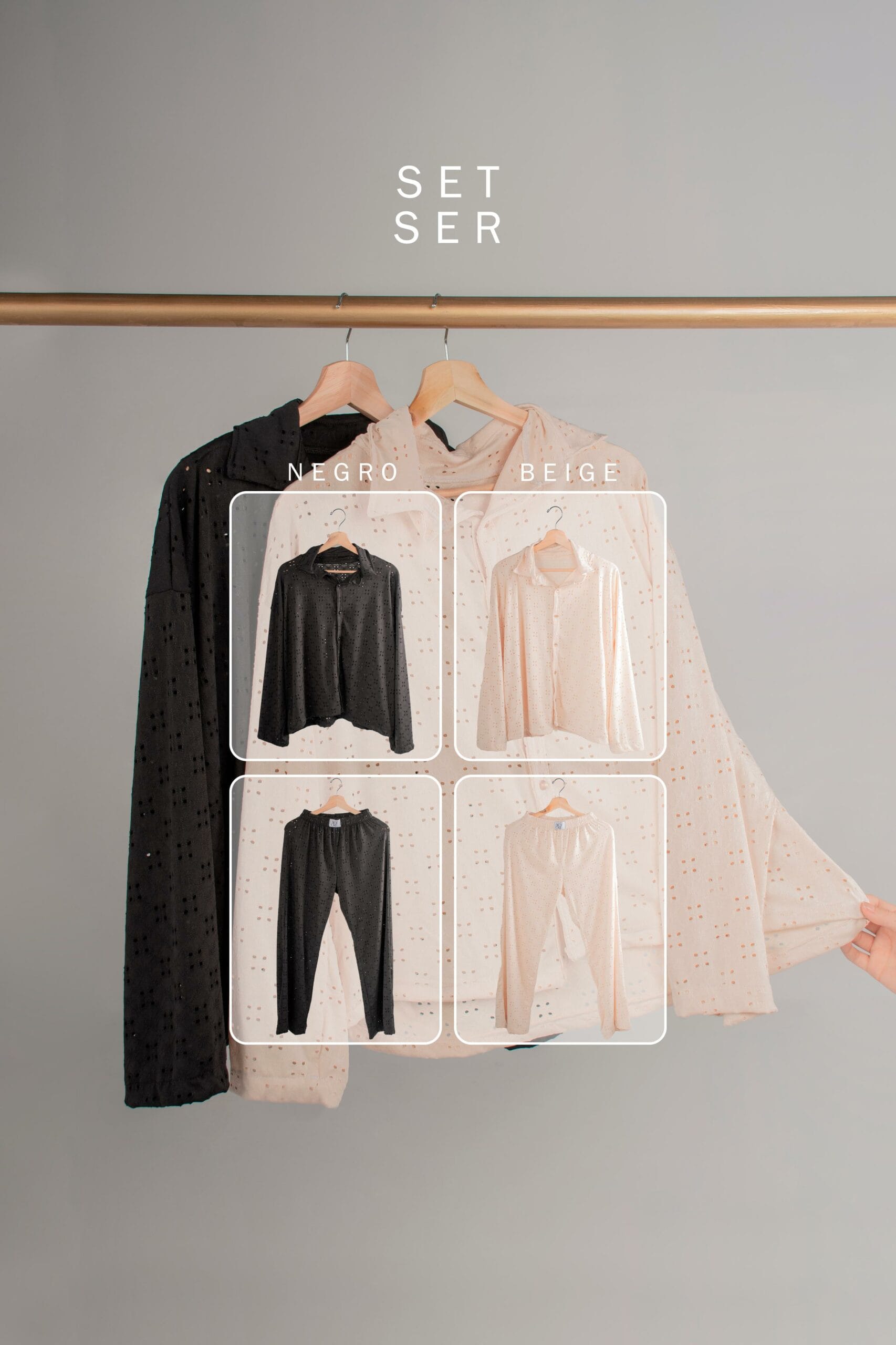 El set Ser está confeccionado en hojalillo: una tela con textura calada, suave al tacto, elástica y perfecta para climas cálidos.