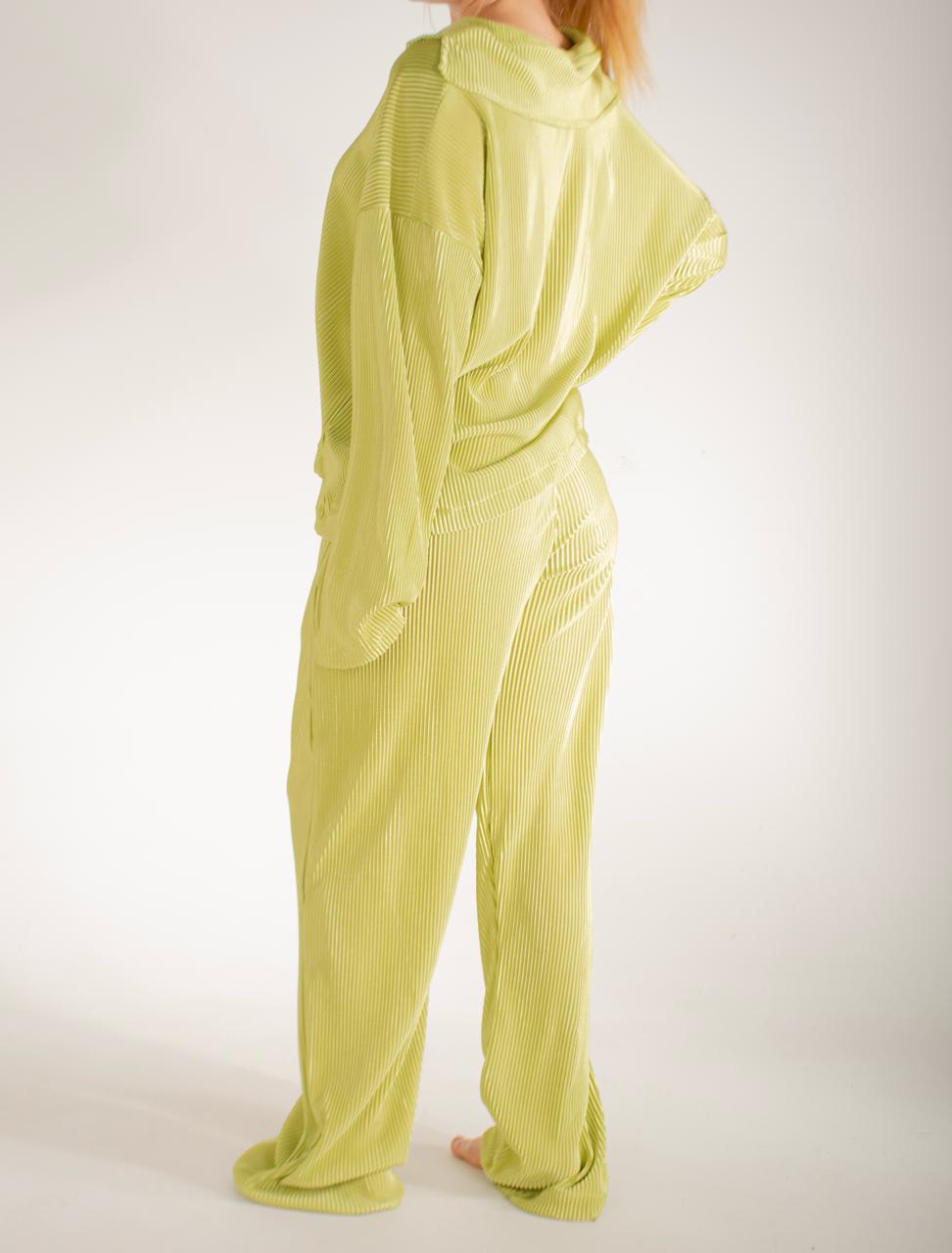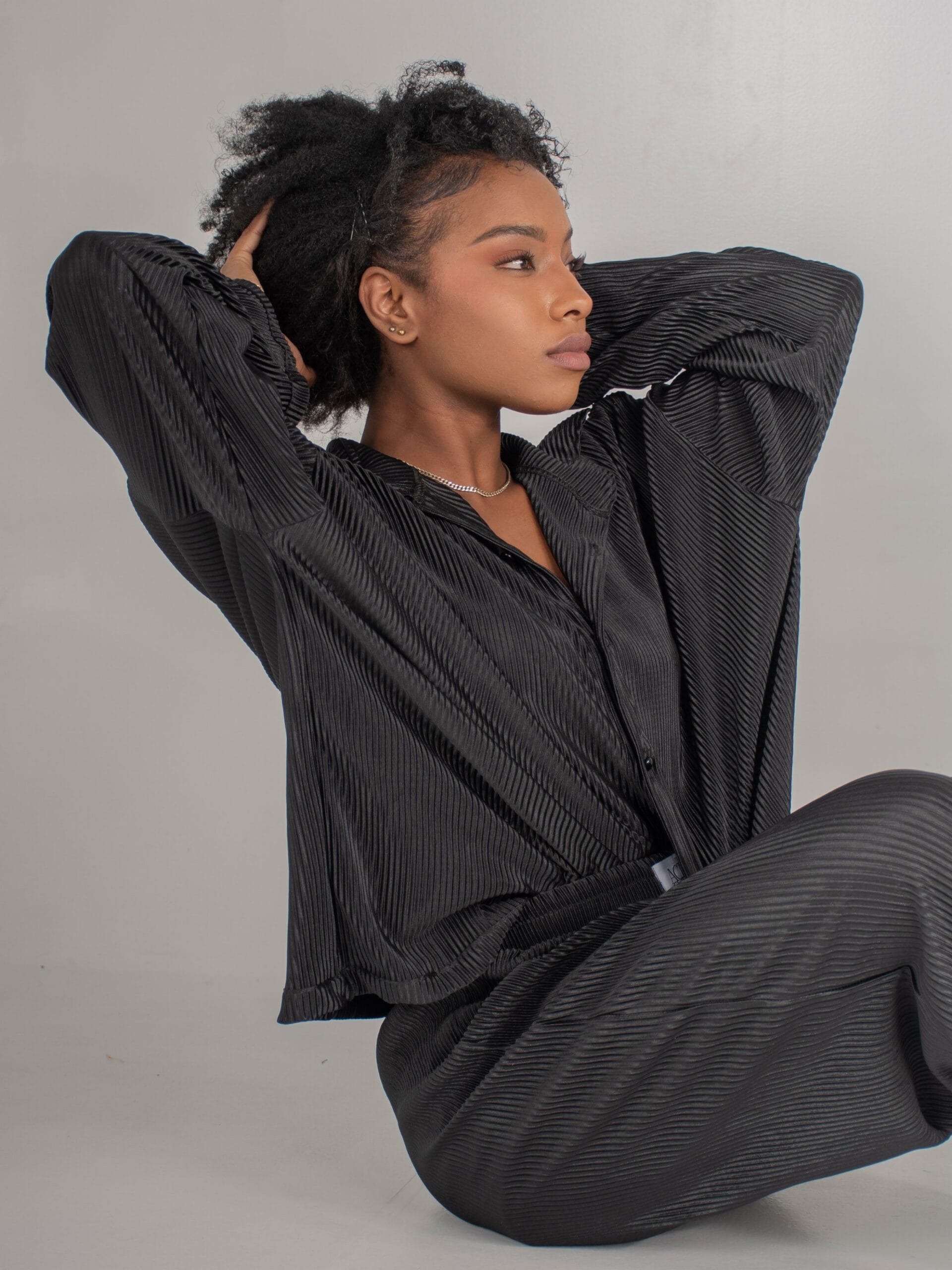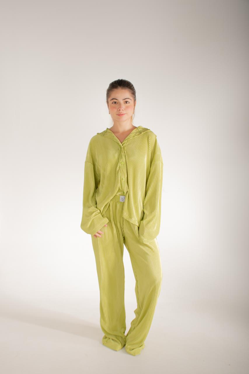 El set Zer está compuesto por camisa y pantalón en una tela tipo seda plizada de poliéster con caída suave y textura sutilmente brillante.
