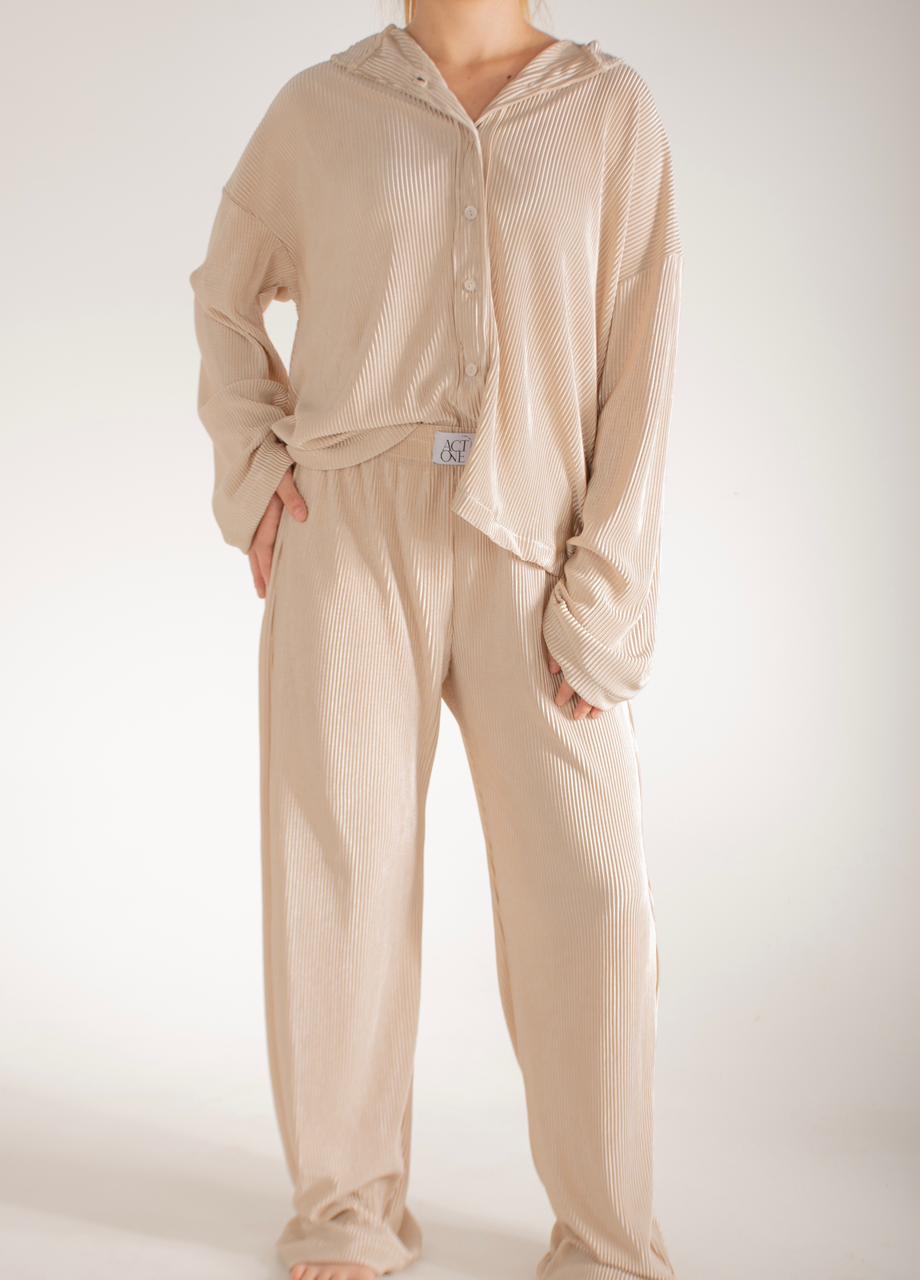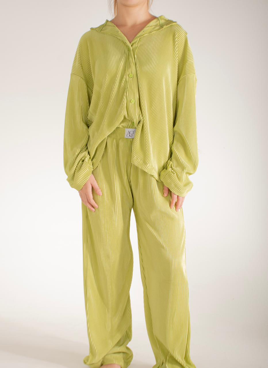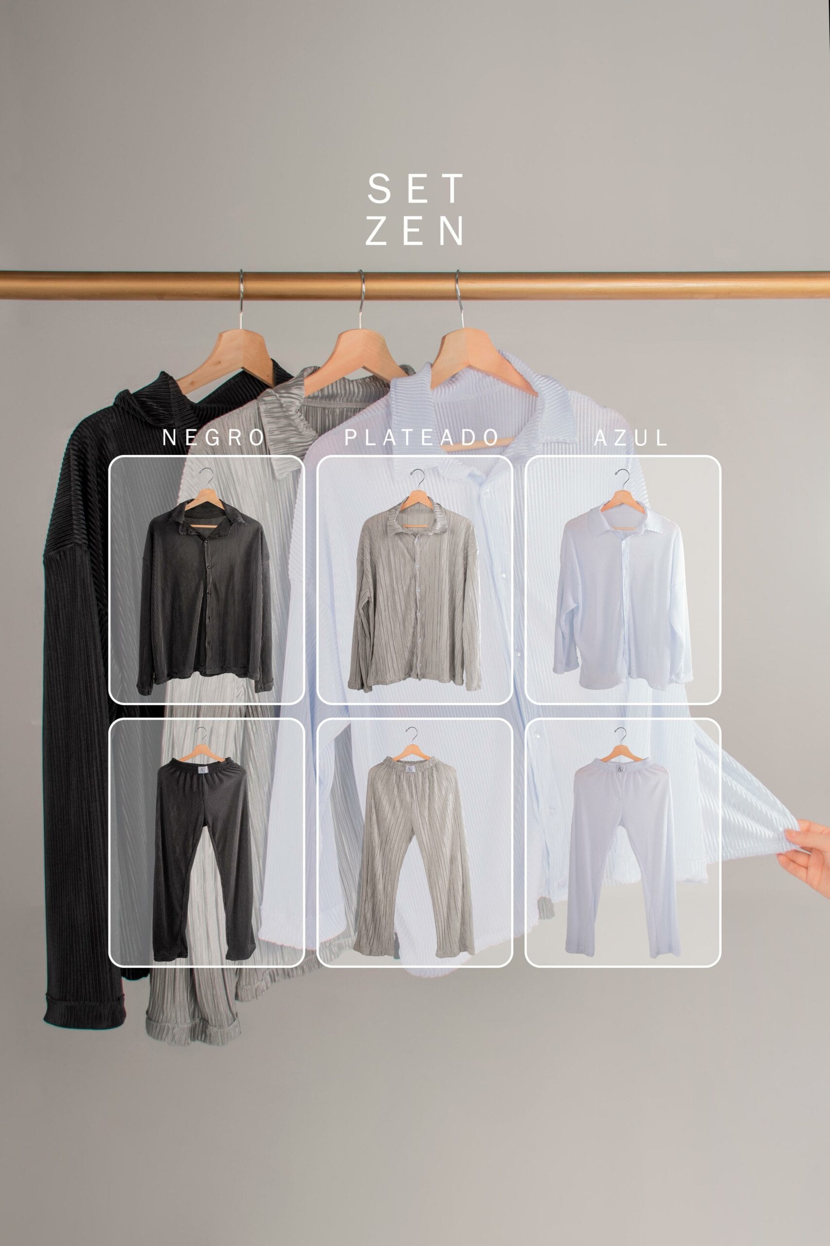 El set Zer está compuesto por camisa y pantalón en una tela tipo seda plizada de poliéster con caída suave y textura sutilmente brillante.